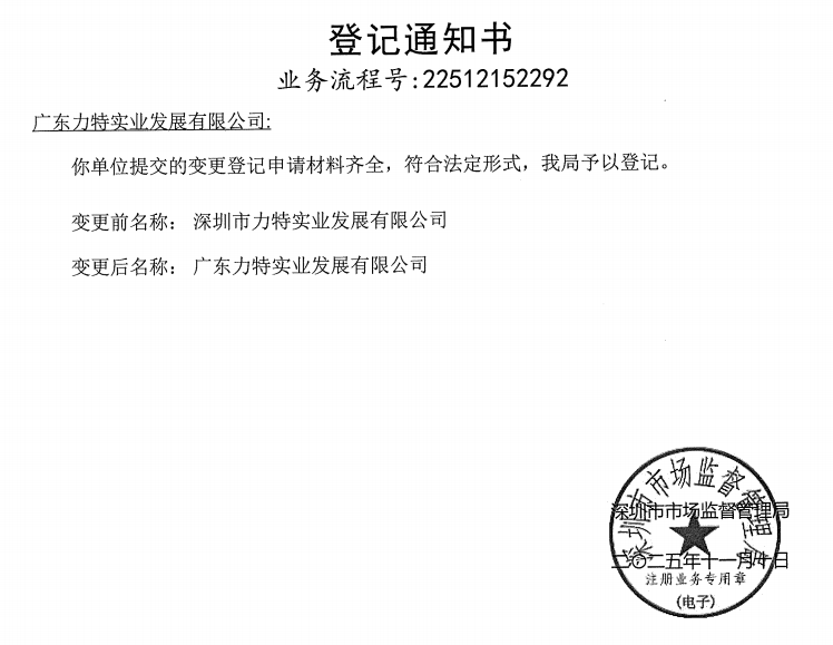 在公司名称变更前后,其法律主体同一,所有债权、债务及对外签订的各项合同、协议等法律文件继续有效。凡以往以“深圳市力特实业发展有限公司”之名义签署及办理的业绩合同及协议、开具或收取的发票及单据、企业资质证书等,其所有权利、义务及法律责任均将由现用名称“广东力特实业发展有限公司”承继并继续履行。前述文件的效力不因公司名称变更而受任何影响。
